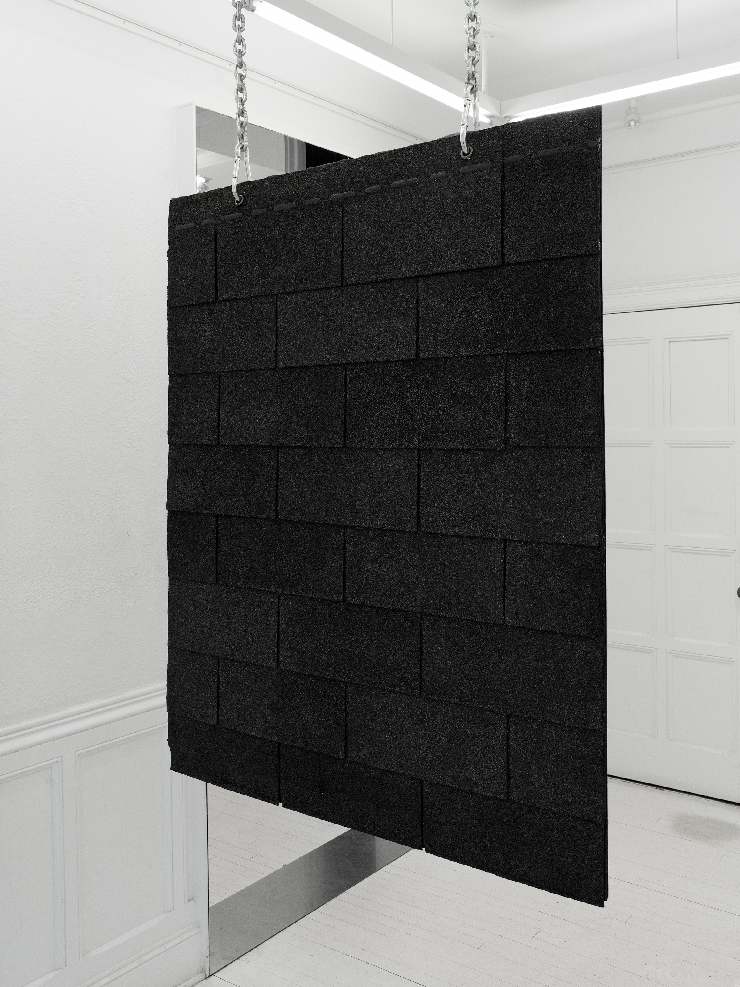 A) Je me souviens de l'odeur de goudron comme de la poussière au fond de ma gorge, 40 x 50 pouces, Impression jet d’encre, membrane synthétique, bardeaux d’asphalte, bois, goudron, chaînes , 2023